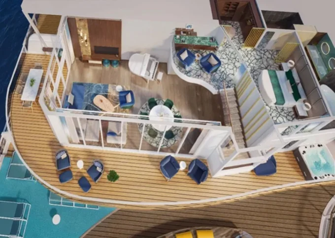 OS - Owner's Suite 61 m² + 17,5 m² balkón s výhľadom na more. 16, 17. paluba vpredu. Max 5 osôb. Výhody Royal Suite Sky Class. 27 306 € 13 653 € za osobu