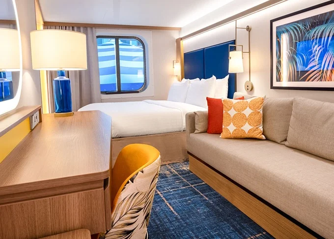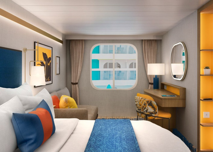 T5 - Vnútorná kajuta s oknom / Surfside Family 17 m². Neotvárateľné okno s výhľadom na štvrť Surfside. 8. paluba vpredu. Max 3-4 osoby. 6 222 € 2 074 € za osobu