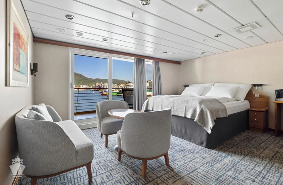 | M2 - Expedition Suite na hornej palube s balkónom 23 m². Balkón, obývacia časť, manželská posteľ, TV, varná kanvica, minibar. 7. paluba. Max 2 osoby. Výhody Suite. | 19 290 € 9 645 € za osobu |