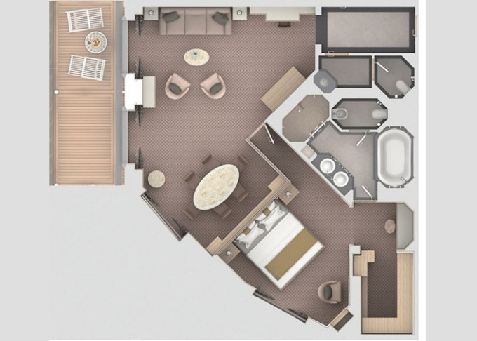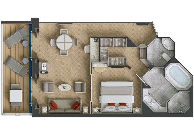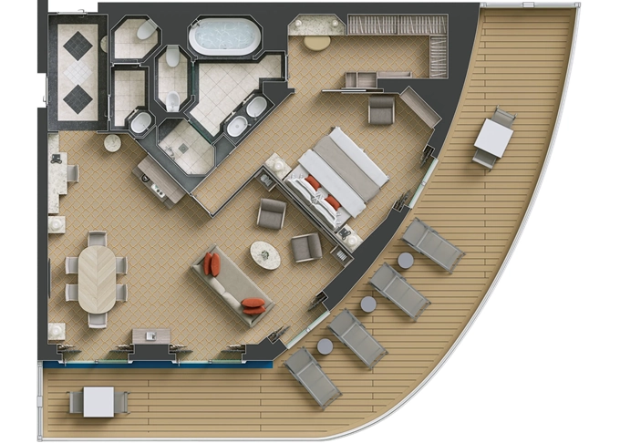 R1 - Royal Suite 1 105 m² (vrátane balkónu). 7. paluba vpredu. Max 3 osoby. 46 800 € 15 600 € za osobu