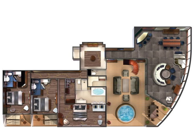 | H2 - The Haven Deluxe Owner's Suite 111 m² / balkón 53 m². 15. paluba vpredu. Max 4 osoby. Výhody The Haven. | 10 458 € 5 229 € za osobu |