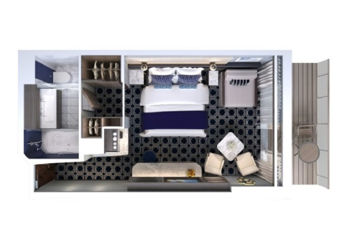 | B6 - Kajuta s veľkým balkónom 31 m² / balkón 14 m². 8. paluba - vpredu. Max 4 osoby. | 4 932 € 2 466 € za osobu |